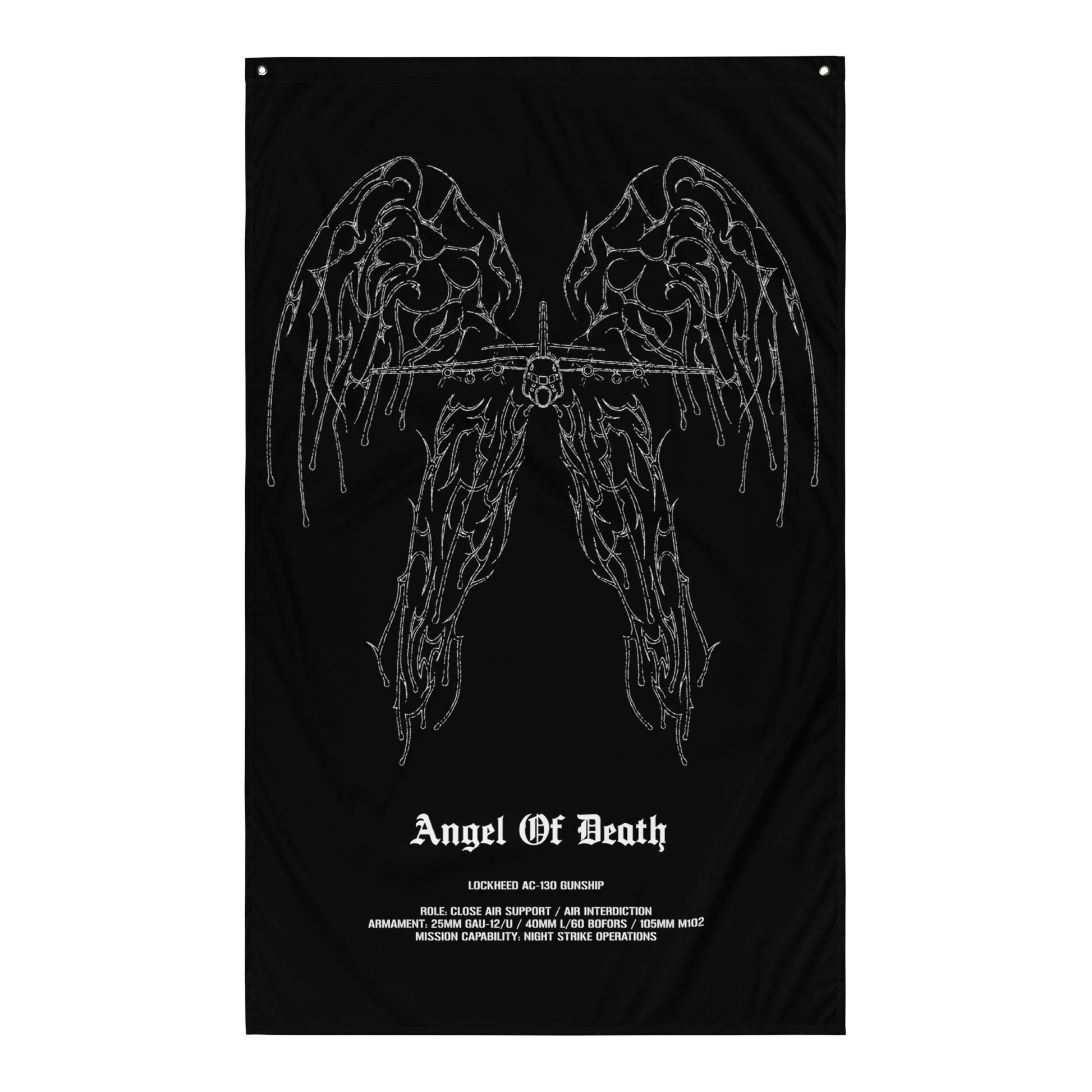 Flag featuring the Lockheed AC-130 gunship, hand-drawn by me. The design shows the aircraft releasing flares mid-flight, forming angelic wings — a nod to its Angel of Death callsign. Printed below are the aircraft’s specs and mission details, honoring one of the most iconic close air support platforms ever built.