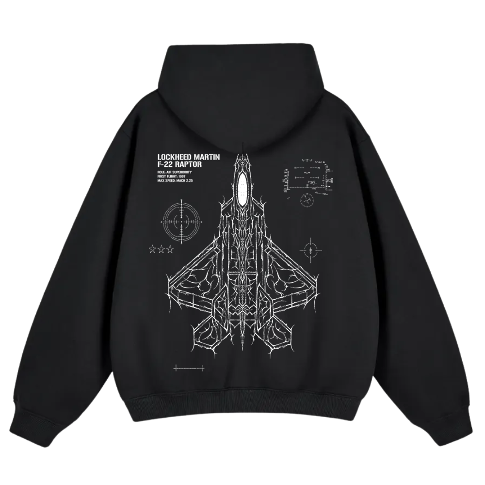 Heavyweight boxy-fit hoodie with a full back print of the Lockheed Martin F-22, drawn by me. The design features HUD graphics, targeting reticles, and callouts with the jet’s key specs. Cybersigilism Curve logo on the front chest.