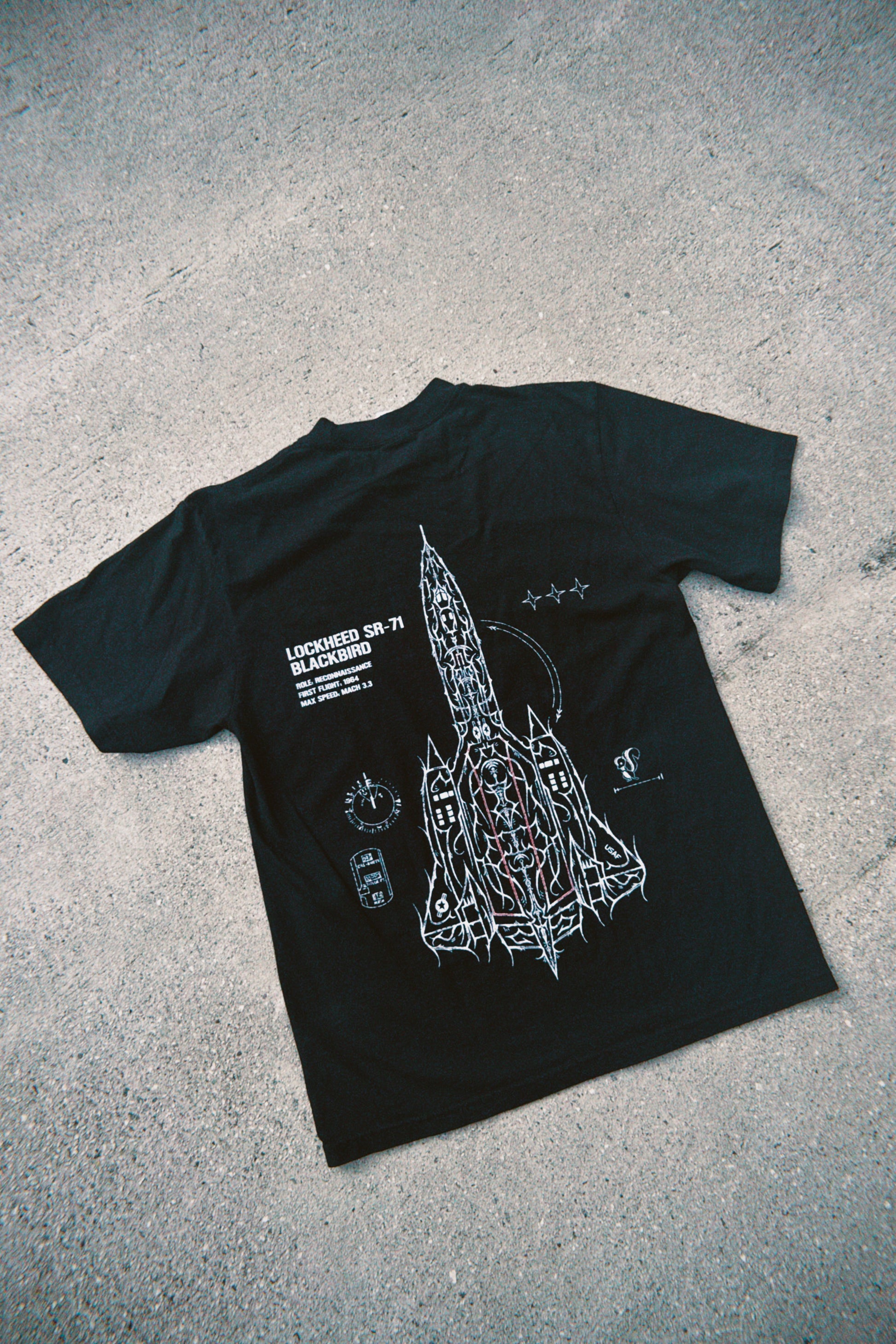 Loose-fit tee with a full cybersigilism back print of the Lockheed SR-71 Blackbird. The design is completely hand-drawn, combining the jet’s silhouette with graphics like the Skunk Works logo and key specs like first flight and Mach speed.